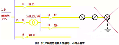 实际工程时常出现错误的应用,如下图所示的SELV回路,安全隔离变压器后面的灯具外壳接地。这是用电设备金属外壳接地的“惯性”思维所致!