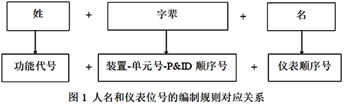 参考家谱中人名的编制方法,采用功能代号-装置号-单元号-P&ID顺序号-仪表顺序号的仪表位号编制方法是把仪表位号中的“功能代号”、“装置-单元号-P&ID顺序号”和“仪表顺序号”,分别对应家谱中“姓”、“字辈”、“名”三个部分,如图1所示。