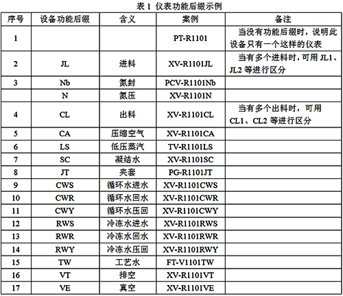 化工厂多由反应釜、储罐、冷凝器、泵、接收罐等设备组成,根据HG/T 20559.5-1993《管道仪表流程图物料代号和缩写词》,仪表位号功能后缀可根据精细化工的特点制定,参考表1所列,也可结合具体项目实际情况进行调整。