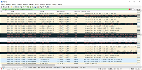 基于这样的疑问,使用!ip.addr==10.16.3.110 &&!ip.addr==10.18.61.8过滤规则,查看其它的不属于该终端的IP地址,发现了有些不属于该终端的一些报文,黑色标识。特殊的是10.18.63.8这个IP地址并不存在于现场的设备中,但是报文中的MAC地址与192.168.61.8的MAC地址也相同。
