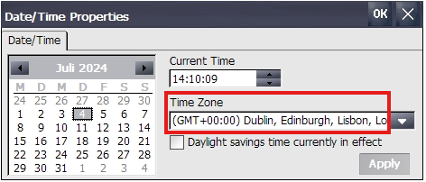当给精智面板进行OS更新后,它的系统时区会恢复为默认值 (GMT+0) Dublin,Edinburgh,Lisbon,London。此时没有改动时区设置,仅将日期时间调整为当时的测试时间,2024/7/4 14:10。
