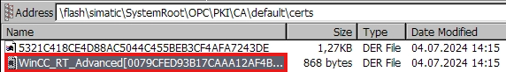 下载程序后,精智面板上会自动创建OPC UA客户端证书文件。可以看到证书的创建时间是GMT+0 时区的2024/7/4 14:15。