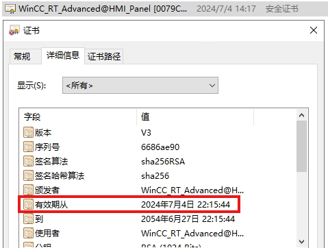 当精智面板与WinCC试图建立通信时,OPC UA 服务器要验证精智面板证书。查看服务器中的客户端证书信息,结果发现证书的有效期是从GMT+8时区的2024/7/4 22:15才开始的。这个时间还没到呢,所以不满足证书的有效期。证书无效,OPC UA通信自然也就无法正常建立了。