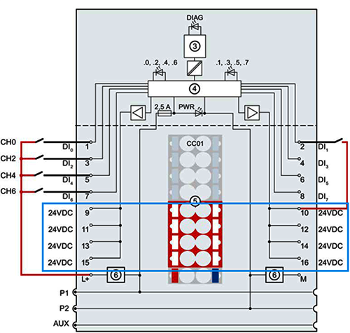 划重点:浅色基座是开启新一个电位组,与前面电位组隔离开。整个电位组的P1、P2、AUX是导通的,P1、P2总线由浅色基座的L+和M提供,一个电位组中如果有辅助端子,则可以对其中一个辅助端子指定电位,这样AUX总线就有了相同的电位。