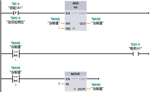按下按钮SB1(I0.0),当前值(MW2,初始值为0)加1,判断当前值不等于0成立,Q0.0置位,电机MI启动。