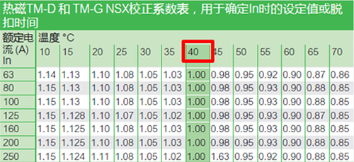 图9 热磁式NSX塑壳断路器温度降容表(部分)