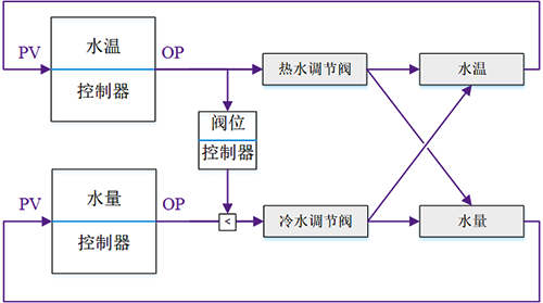 阀位控制器当检测到水温控制器输出,处于较高阀位有失控风险时,会减少PID控制器输出并通过低选超驰控制关小冷水调节阀,从而放弃水量控制保证水温控制。这个方案有两个问题:①热水阀不能全开,极致性能没有达到;②阀位控制调节缓慢,动态性能可能略差。