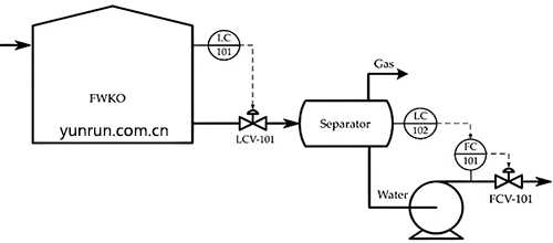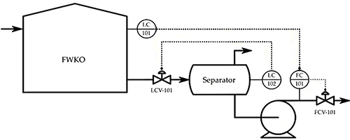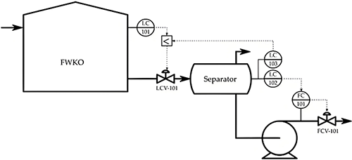 对于FWKO罐,液位为控制变量,出口流量阀LCV-101为操纵变量。对于分离器,由于泵的非线性动力学,采用串级液位(LC-102)输出流量(FC-101)控制回路来改进液位控制。