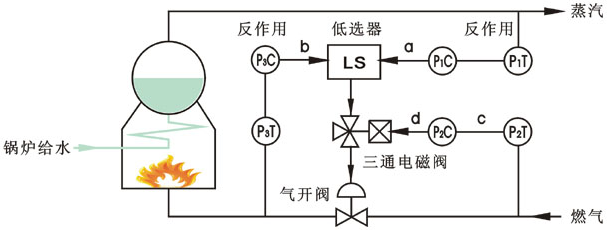 说明:图中P1C为根据蒸汽压力调节燃气量的调节系统;P2C为根据燃气锅炉进口压力调节燃气量的调节系统;P3C是根据燃气总管压力调节燃气量的调节系统正常工况时,蒸气压力P1上升,a下降,d下降,阀门关小,燃料气流量减小,使P1下降,实现控制。