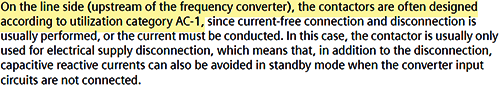 所以,在西门子技术文件《Industrial Controls System Manual》中,对于变频器前端的进线接触器K1(图7),也推荐采用AC-1使用类别选型(图6)。