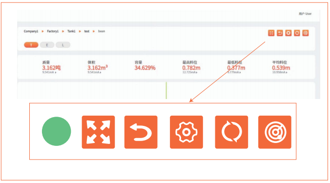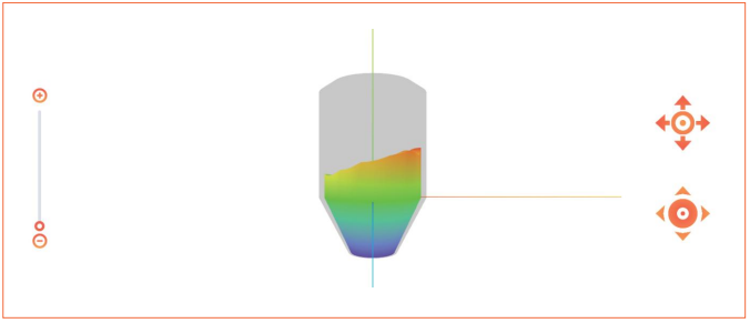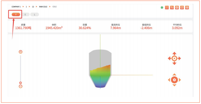 用于显示罐体模型以及罐体内物料表面的三维形态。在此状态下,可通过+/-按键进行放大缩小操作。罐体三维模块的右侧按键 ,点击该按键