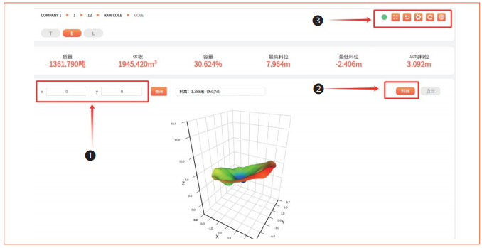 标号②:用于切换显示的三维形态为点云形式还是料面形式。切换好状态下,可通过按住鼠标左/右键进行拖动及旋转操作,通过按住鼠标中间的滚轮进行放大缩小操作。