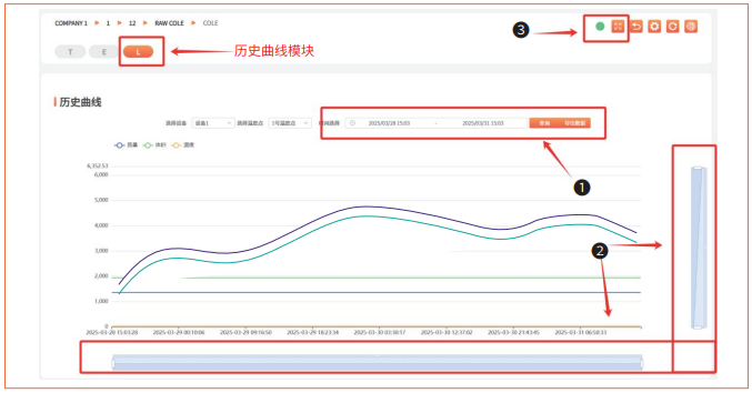 用于显示罐体内物料体积、质量的历史数据,同时能够根据历史数据形成的历史曲线观察进出料的趋势,此外,可将历史数据导出,下载保存在固定路径(同浏览器自身的下载路径设置)