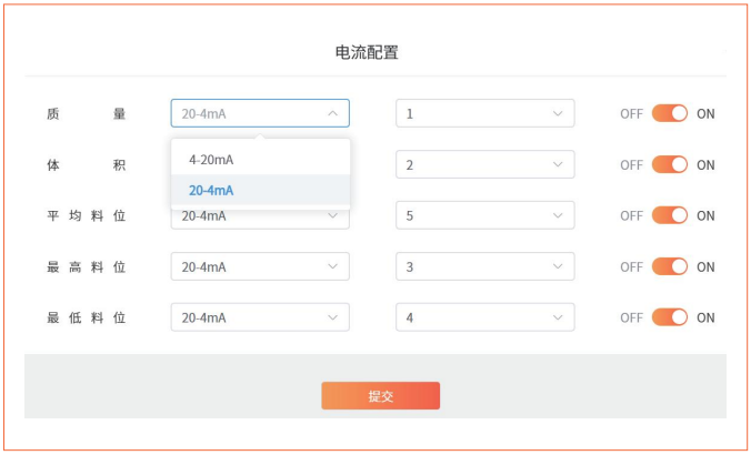 f、六种报警方式:最高料位、最低料位、平均料位、容量、体积、质量。每一种报警都有报警高位和低位,当指标大于高位或低于低位后会触发报警显示效果。