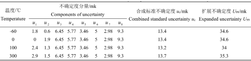 置信概率取p=99%,k=2.58,将各检定点标准不确定度依次带入式13,得到精密铂电阻温度计在检定点的扩展不确定度U99。