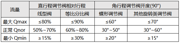 在《自动化仪表选型设计规范》HG/T20507-2014中调节阀开度推荐如下范围: