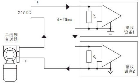 在应用中,我们还会经常遇到将一个变送器信号接入两个或两个以上接收装置的情况,若采用串联环路,则环路中任一处开路都会造成整个环路上的仪表无信号,而且负载电阻之和很容易超过变送器的负载能力 还必须保证两个负载信号之间参考点不一样,如图3。
