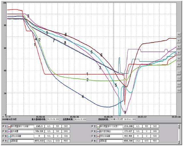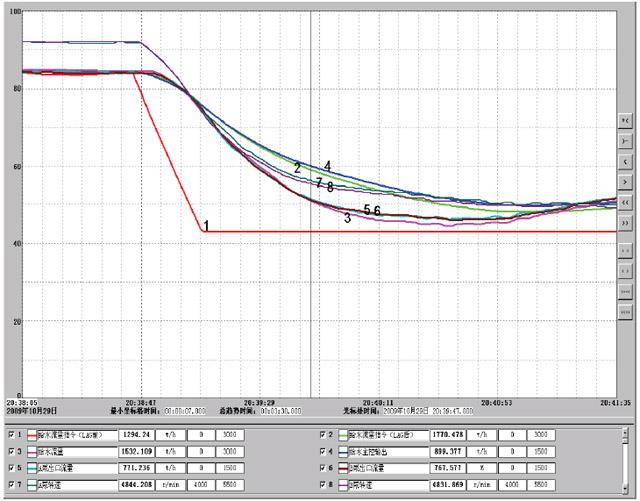 由于实际给水流量已经瞬间减少了一半,协调给水与燃料特性的滞后时间LAG只需要稳定运行泵在最高转速运行即可,因此,LAG尽可能在大些,否则在给水指令的迅速下降过程中,由于前馈的作用,反而会降低给水泵的转速。