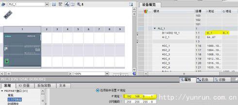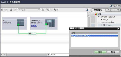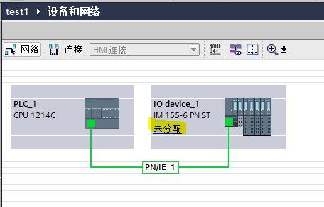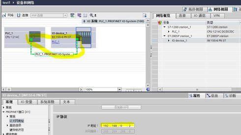 4、在网络视图中用鼠标把网口连起来,自动给这个接口模块分配了同网段IP地址,可以改成别的,但要保证和那个CPU1214C控制器在同一网段就可以,如下图: