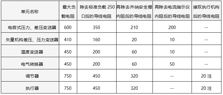 20世纪80年代,上海自动化仪表一厂针对其生产的DDZ-Ⅲ型电动单元组合仪表的变送器、调节器、电气转换器、操作器等单元,在最低供电电压(22.8V)时允许的导线电阻,曾列过一个表格供用户参考,表后还注明:“如果系统设计时导线电阻不超过上表,则信号电流在4-20mA范围内,都能保证传送的精度不变。”由于其还有现实意义,特把此表格提供如下: